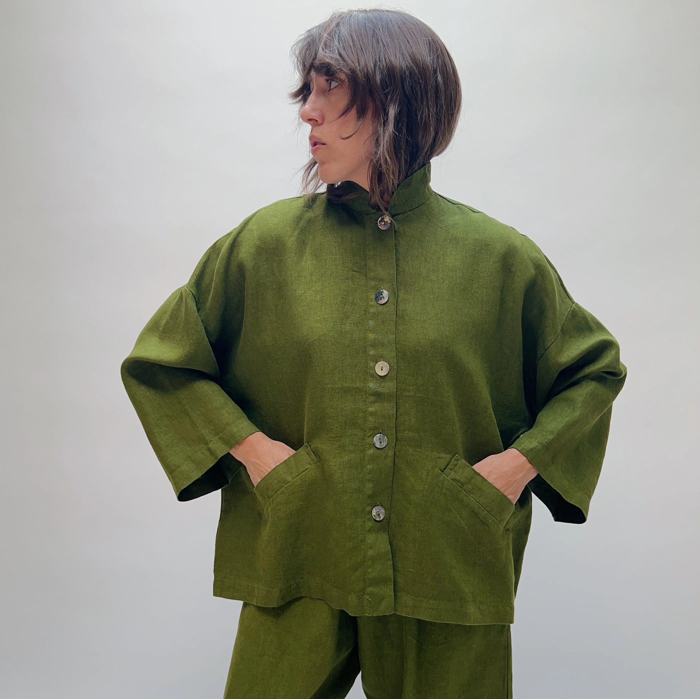 A lovely linen jacket with shell buttons down the front and a standing collar.