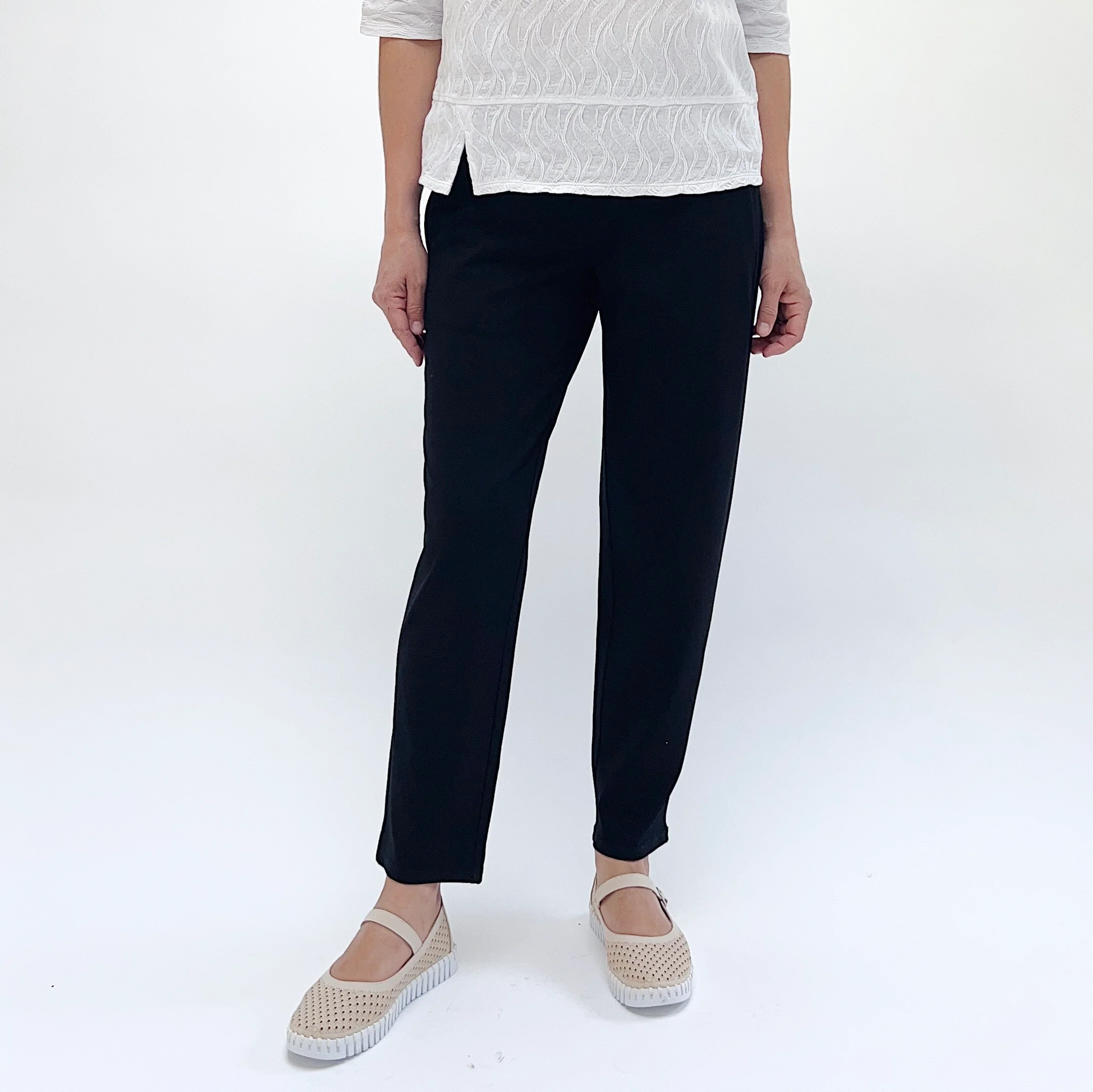 Feel comfy, look polished! The throw in your suitcase travel ready solution. The knit alternative to your structured black pant. The pockets are cleverly placed in the slightly forward side seams. The contour waist band is forgiving and slimming. We recommend sizing down one size from your normal size in this style.Â