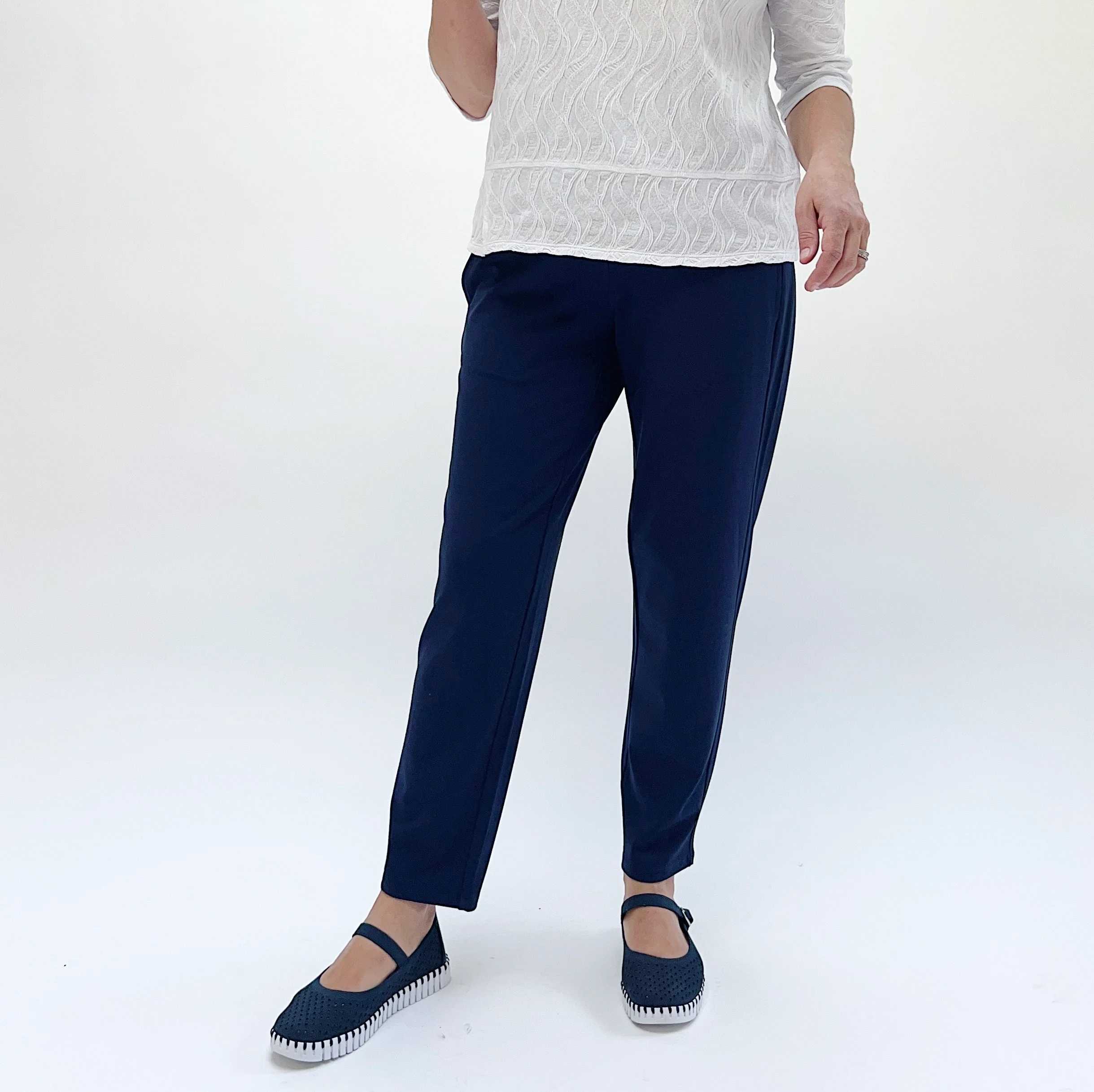 Feel comfy, look polished! The throw in your suitcase travel ready solution. The knit alternative to your structured black pant. The pockets are cleverly placed in the slightly forward side seams. The contour waist band is forgiving and slimming. We recommend sizing down one size from your normal size in this style.Â