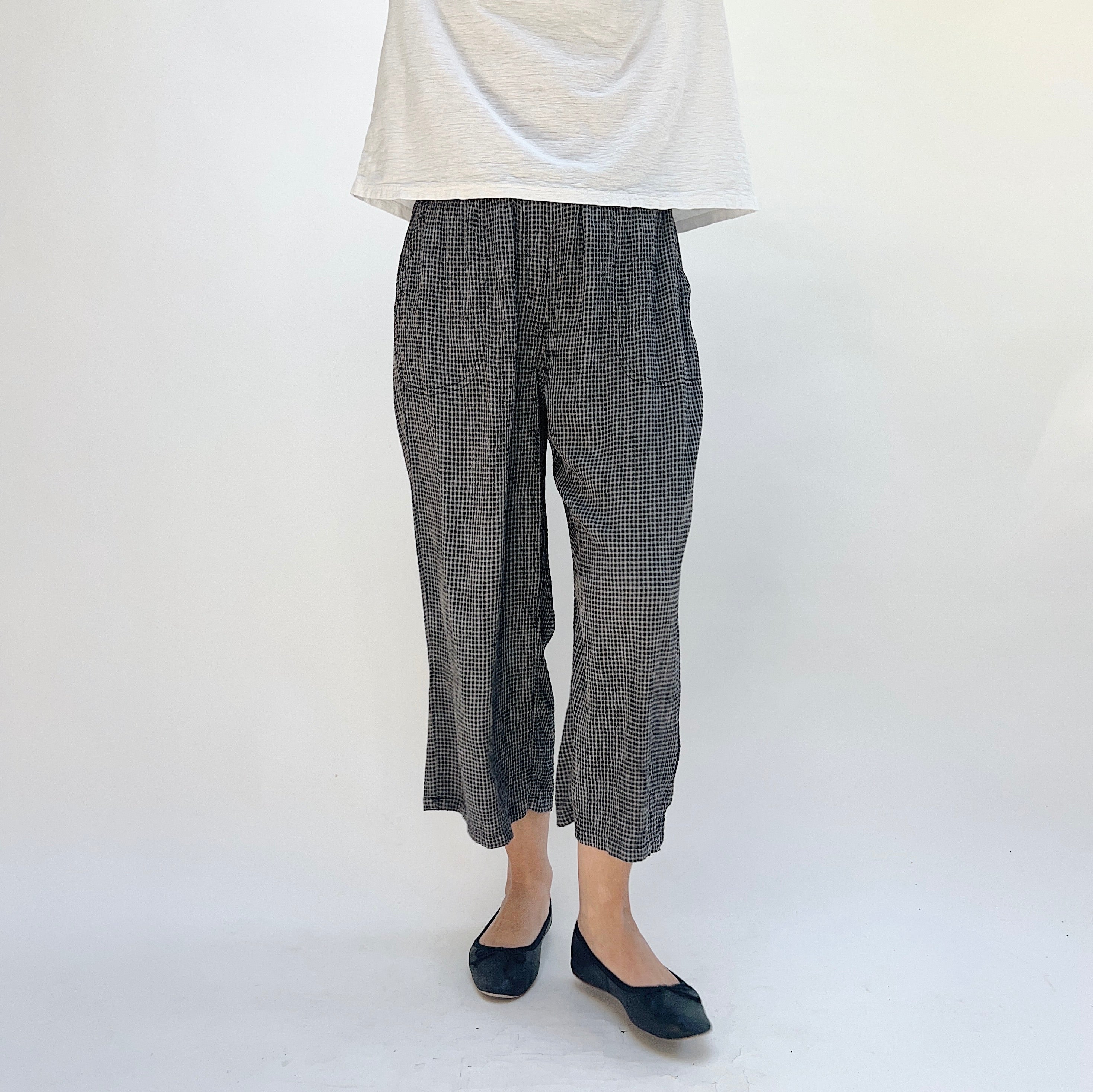 Chic and easy lightweight checkered pant with cropped leg, elastic waistband, and two pockets.