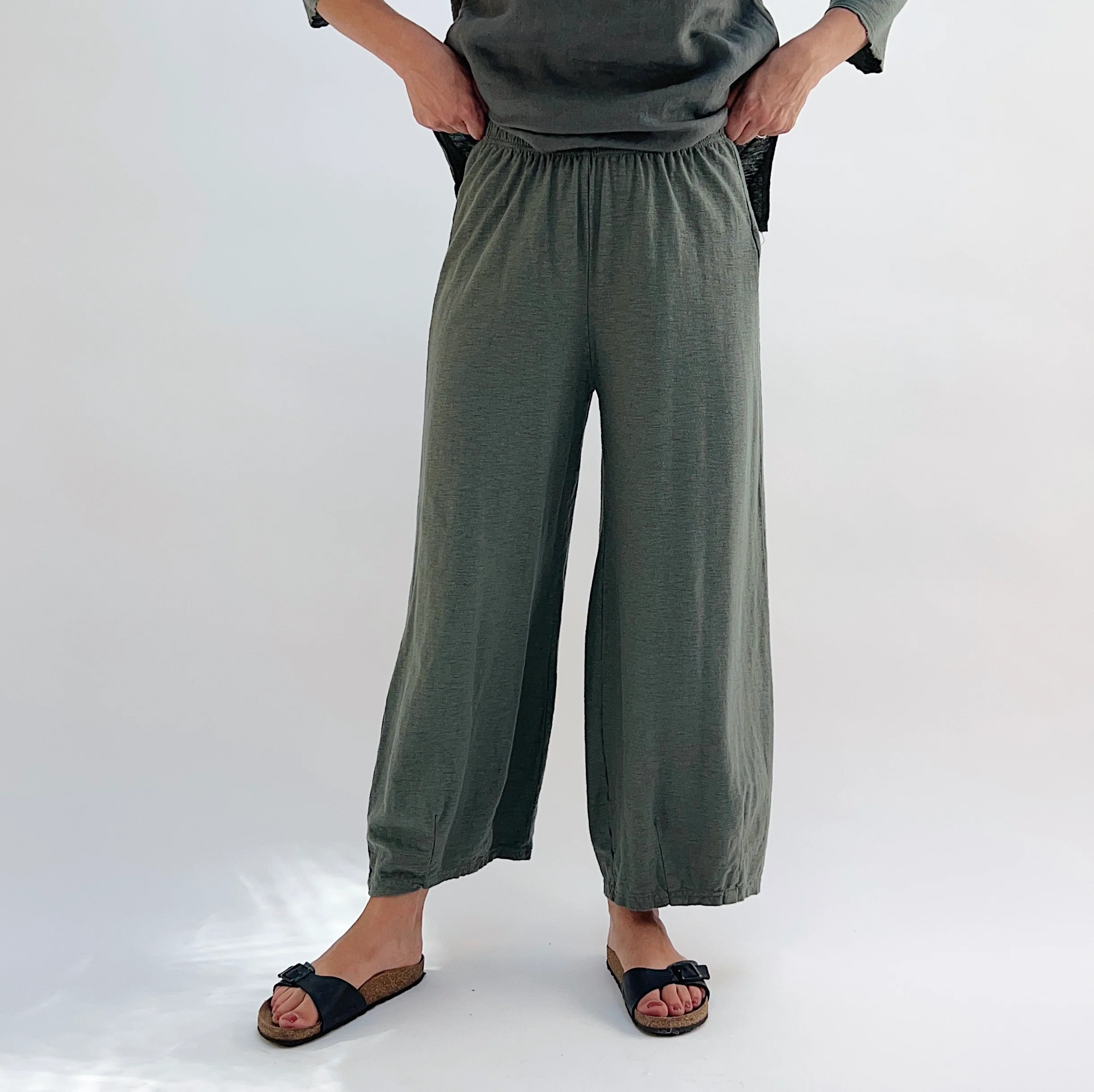 The perfect go-to pants with an elastic waist and darts at each hemline to create a rounded leg.