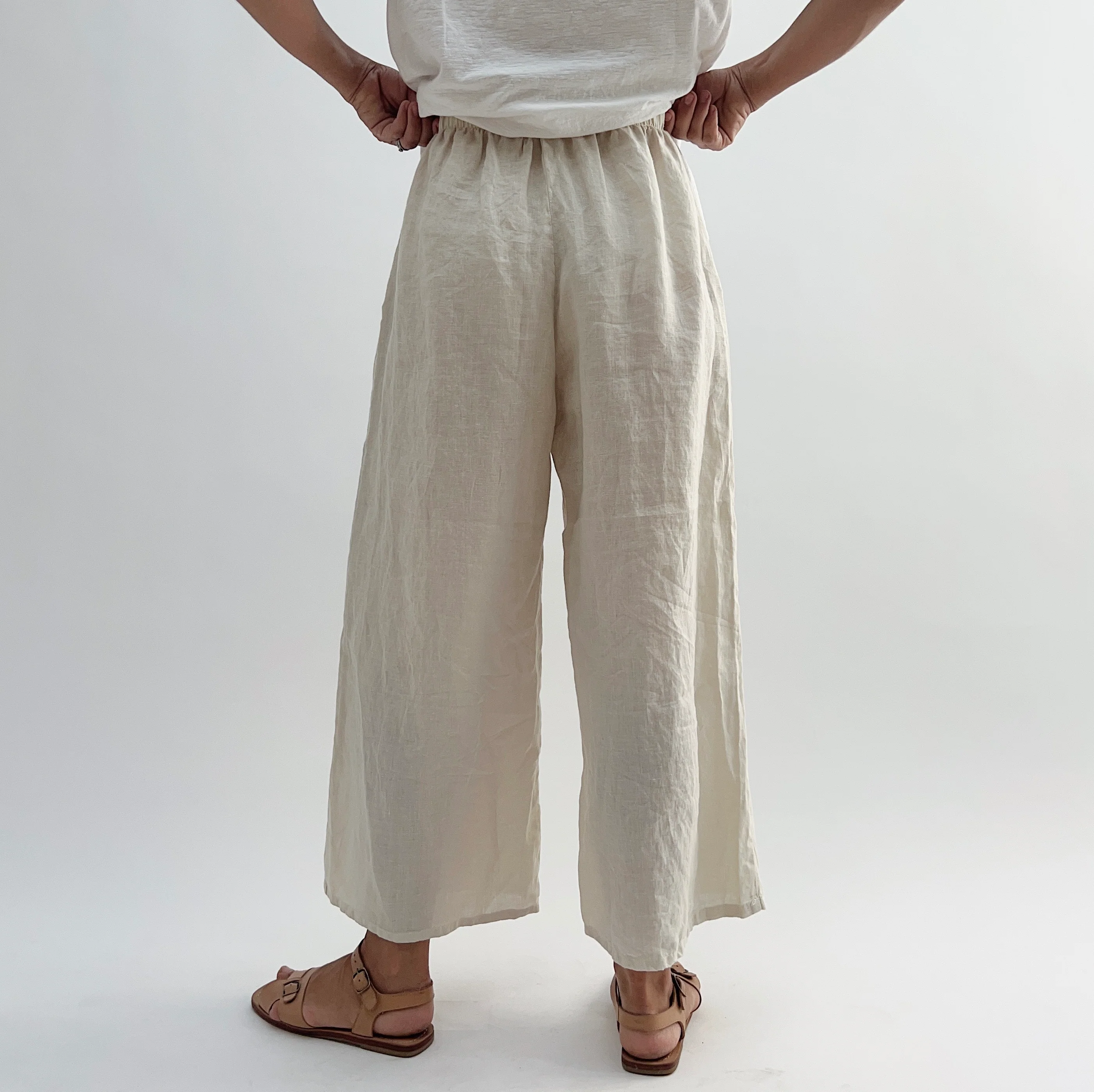 Super comfortable and chic linen pants featuring a cropped leg, an elastic waistband, and two pockets.