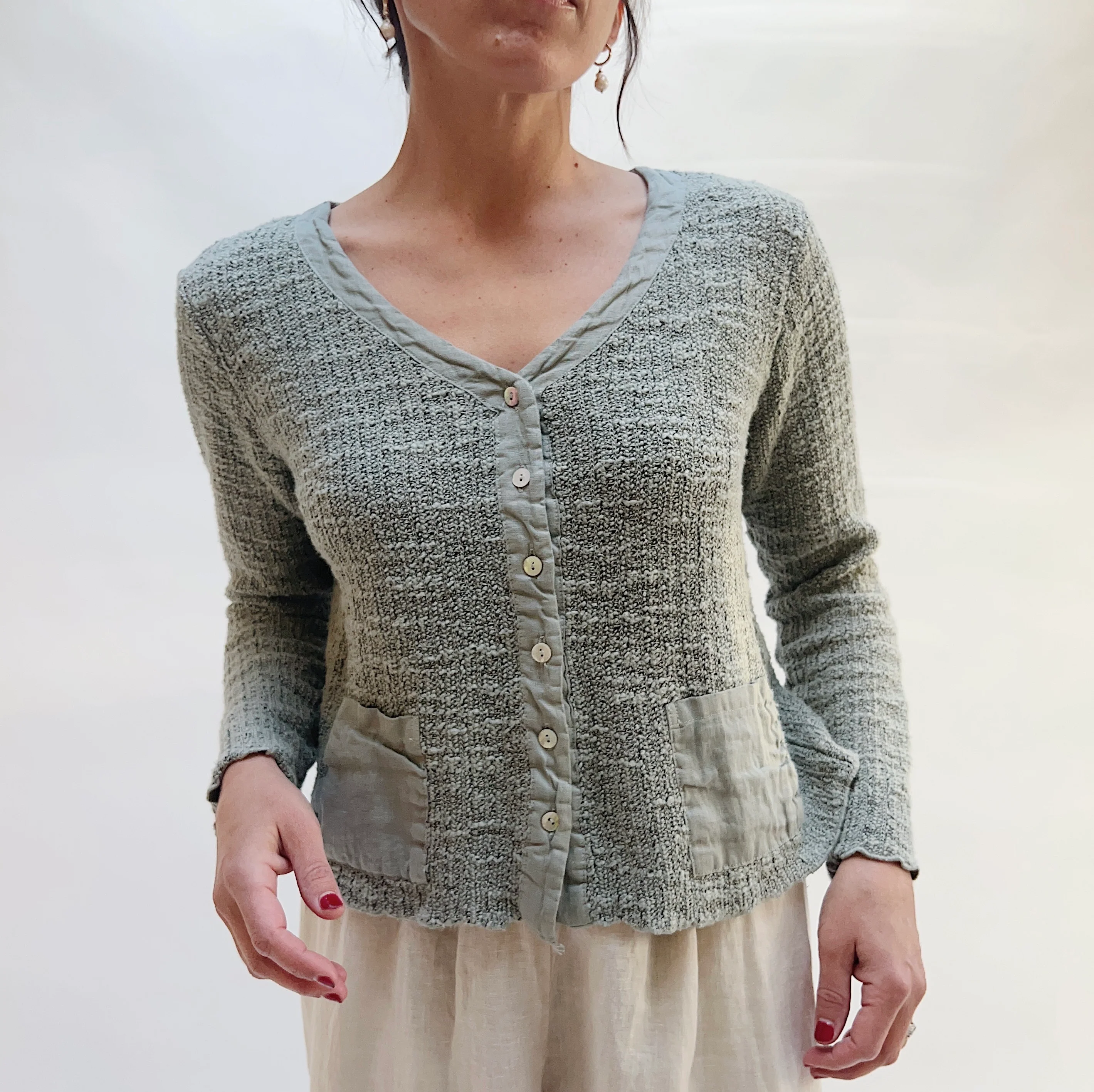 Linen and Knit Cropped Pocket Cardigan in Overcast